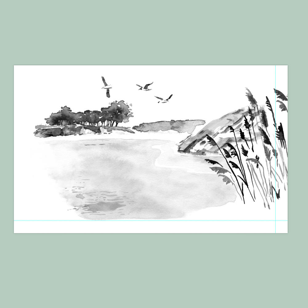 La scène a été dessinée à l’encre de chine, au lavis. Le papier peint possède les caractéristiques suivantes :